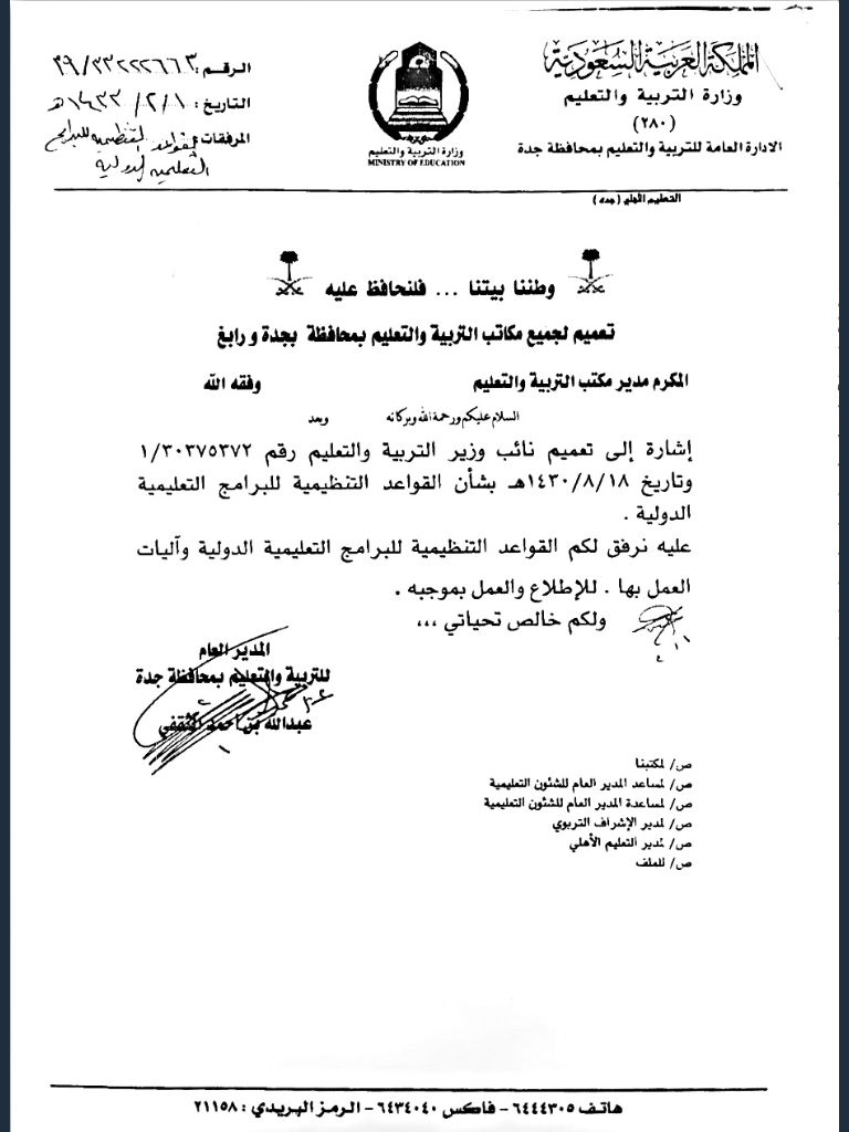 1 ارسال الضوابط التنظيمية لتطبيق البرامج التعليمية الدولية في المدارس الأهلية ونموذج طلب الموافقة على تطبيق برنامج تعليمي في مدرسة أهلية مــــــــدونة تعـــــــــاميم
